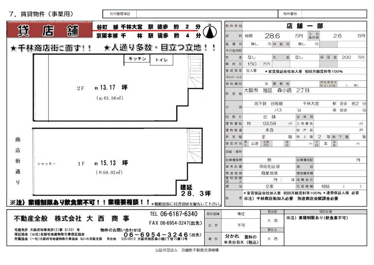千林商店街に面しており、谷町線千林大宮駅まで徒歩2分の為、人通りが多い物件です!2階にはキッチンとトイレがあります!敷・礼なしです!